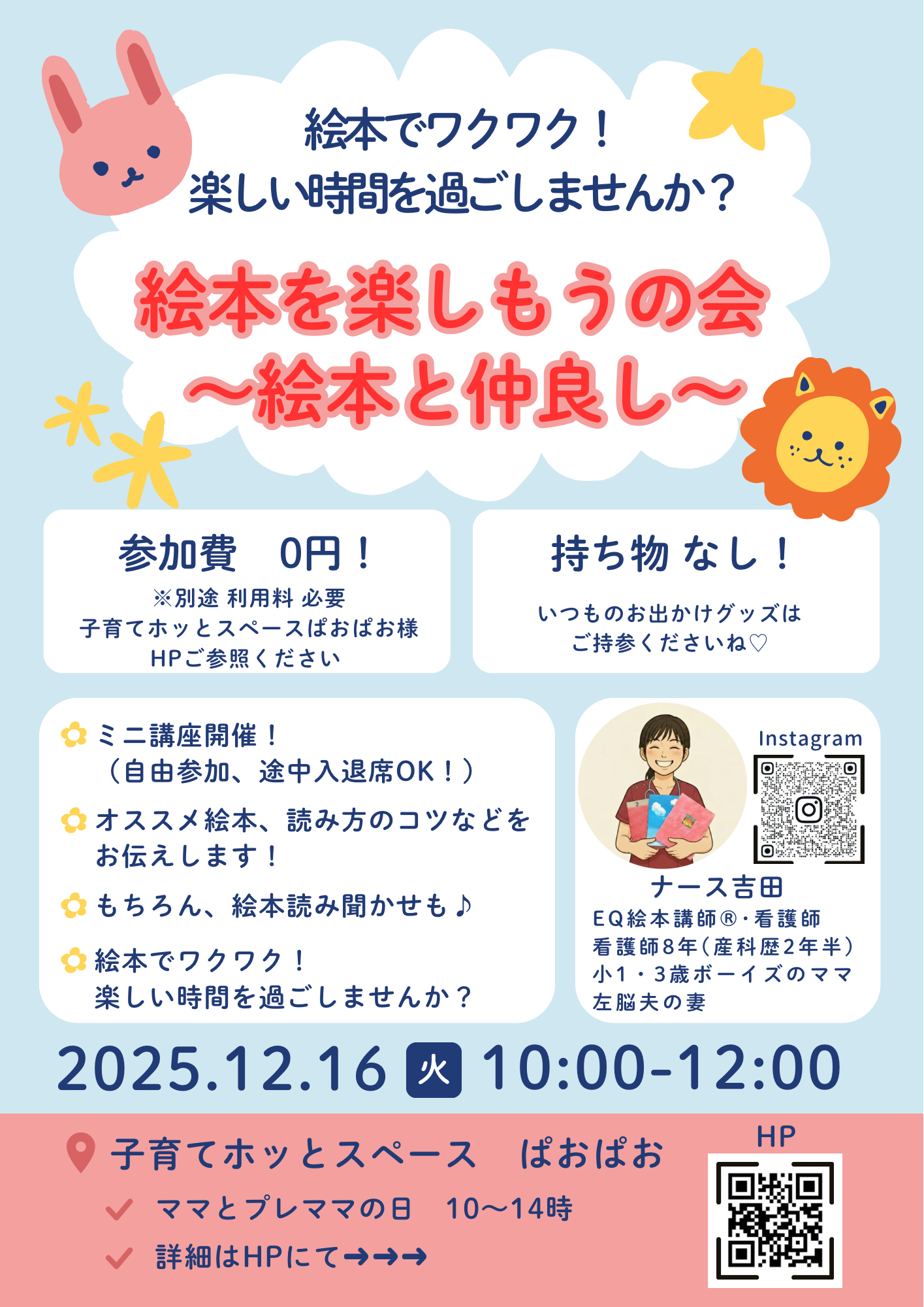 予定やおすすめイベントなどを載せていますのでオープンチャット「子育てホッとスペースぱおぱお」で検索してください