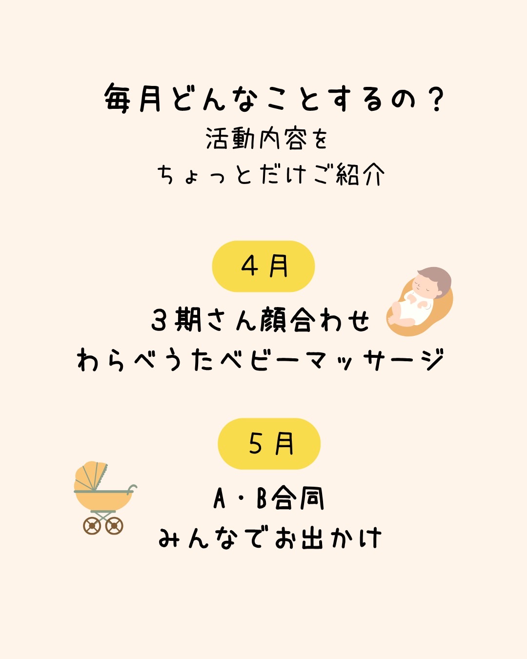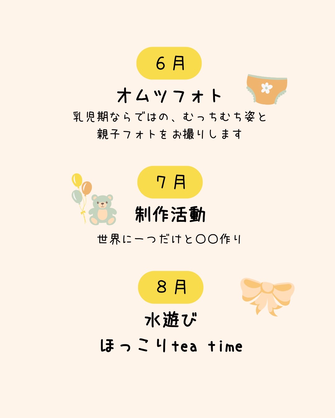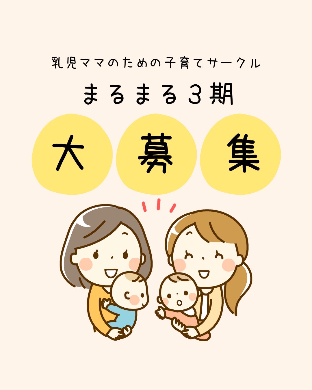 まるまる3期B日程 2026.02.03 日時 2026/07/17 10:00 - 12:00 開催場所 子育てホッとスペース ぱおぱお カテゴリー 0歳児 ママ 地域 子育て 応募については2月1日10時から開始。 詳細は「まるまる」のInstagram、もしくは子育てホッとスペースぱおぱおのブログなどでご確認ください
